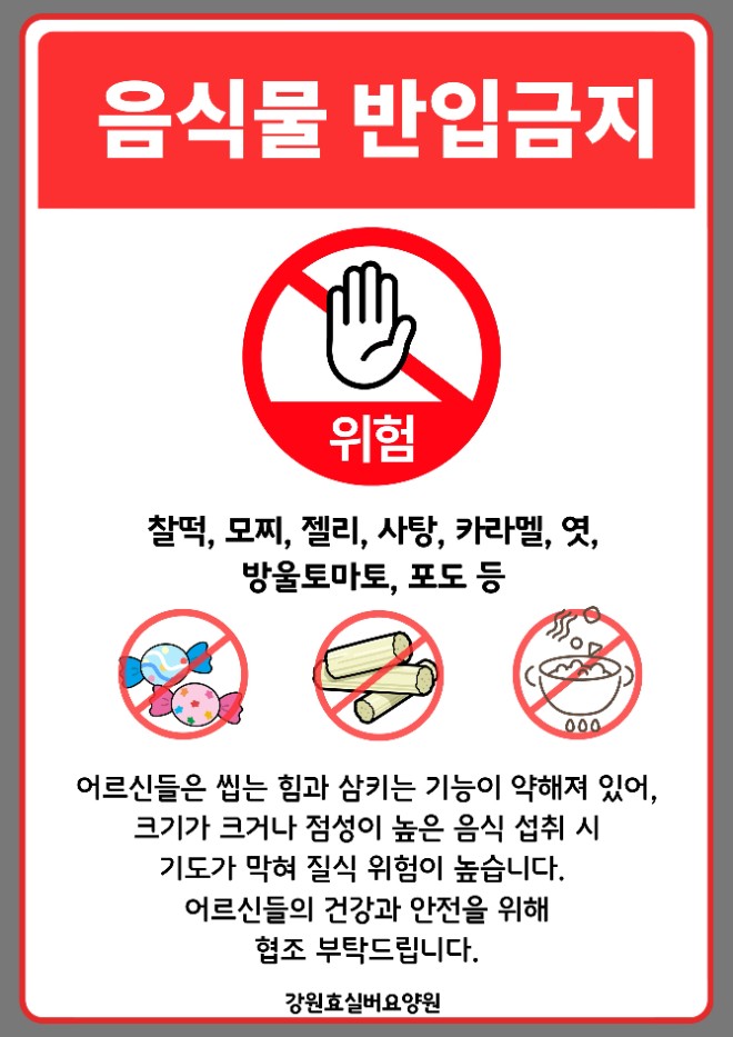 어르신들의 씹기·삼키기 기능이 약해 질식 위험을 줄이기 위해 일부 음식 반입을 제한하고 있어 안내드립니다. 협조 부탁드립니다. 감사합니다. |