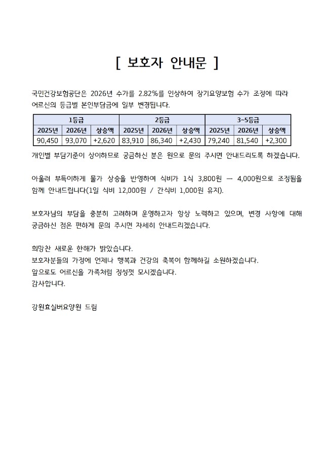국민건강보험공단은 2026년 수가를 2.82%를 인상하여 장기요양보험 수가 조정에 따라 어르신의 등급별 본인부담금에 일부 변경됩니다. 개인별 부담기준이 상이하므로 궁금하신 분은 원으로 문의 주시면 안내드리도록 하겠습니다. 아울러 부득이하게 물가 상승을 반영하여 식비가 1식 3,800원 → 4,000원으로 조정됨을 함께 안내드립니다(1일 식비 12,000원 / 간식비 1,000원 유지). 보호자님의 부담을 충분히 고려하며 운영하고자 항상 노력하고 있으며, 변경 사항에 대해 궁금하신 점은 편하게 문의 주시면 자세히 안내드리겠습니다. 희망찬 새로운 한해가 밝았습니다. 보호자분들의 가정에 언제나 행복과 건강의 축복이 함께하길 소원하겠습니다. 앞으로도 어르신을 가족처럼 정성껏 모시겠습니다. 감사합니다. - 강원효실버요양원 드림 - |