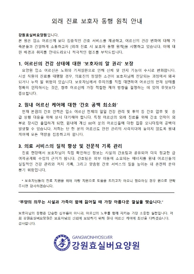 외래 진료 보호자 동행 원칙 안내 강원효실버요양원입니다. 본 원은 입소 어르신께 보다 집중적인 간호 서비스를 제공하고, 어르신의 건강 변화에 대해 가족분들과 긴밀하게 소통하고자 [외래 진료 시 보호자 동행 원칙]을 시행하고 있습니다. 이에 대한 배경과 취지를 안내드리오니 적극적인 협조를 부탁드립니다. 1. 어르신의 건강 상태에 대한 '보호자의 알 권리' 보장 요양원 입소 어르신은 노화와 기저질환으로 인해 신체 및 인지 기능이 수시로 변화합니다. 시설 직원이 진료를 대행할 경우, 의료진의 정밀한 소견이 보호자님께 전달되는 과정에서 왜곡되거나 누락 될 위험이 있습니다. 보호자님께서 주치의를 직접 대면하여 어르신의 현재 상태를 정확히 인지하시는 것은, 향후 어르신께 가장 적합한 케어 방향을 결정하는 데 있어 무엇보다 중요합니다. 2. 원내 어르신 케어에 대한 '간호 공백 최소화' 현재 본원의 간호 인력은 입소 어르신 전체의 일일 건강 관리 및 투약 등 간호 업무 및 응급 상황 대응을 위해 상시 대기해야 합니다. 특정 어르신의 외래 진료를 위해 간호 인력이 외부로 장시간 출입하게 되면, 원내에 계신 80여 분의 어르신들에 대한 집중 모니터링에 공백이 발생할 수 있습니다. 저희는 단 한 분의 어르신도 안전 관리의 사각지대에 놓이지 않도록 원내 케어에 모든 역량을 집중하고자 합니다. 3. 의료 서비스의 질적 향상 및 전문적 기록 관리 진료 현장에서 보호자님이 직접 확인하신 정보는 시설의 간호팀과 공유되어 더욱 정교한 급여제공계획 수립의 근거가 됩니다. 간호팀은 외부 이동에 소모되는 에너지를 원내 어르신들의 실질적인 건강 관리와 처치 기록, 그리고 맞춤형 간호 서비스의 질을 높이는 데 온전히 쏟아 붓기 위함입니다. * 보호자님들의 진료 지원을 위해 차량 지원으로 도움을 드리고자 하오니 필요하실 경우 원으로 연락주시면 감사하겠습니다. "부양의 의무는 시설과 가족이 함께 짊어질 때 가장 아름다운 결실을 맺습니다.“ 보호자님의 동행은 단순한 심부름이 아니라, 어르신의 노후를 함께 지키는 가장 소중한 실천입니다. 저희 강원효실버요양원은 보호자님의 신뢰에 보답하기 위해 원내 어르신 케어에 최선을 다하겠습니다. 감사합니다. |